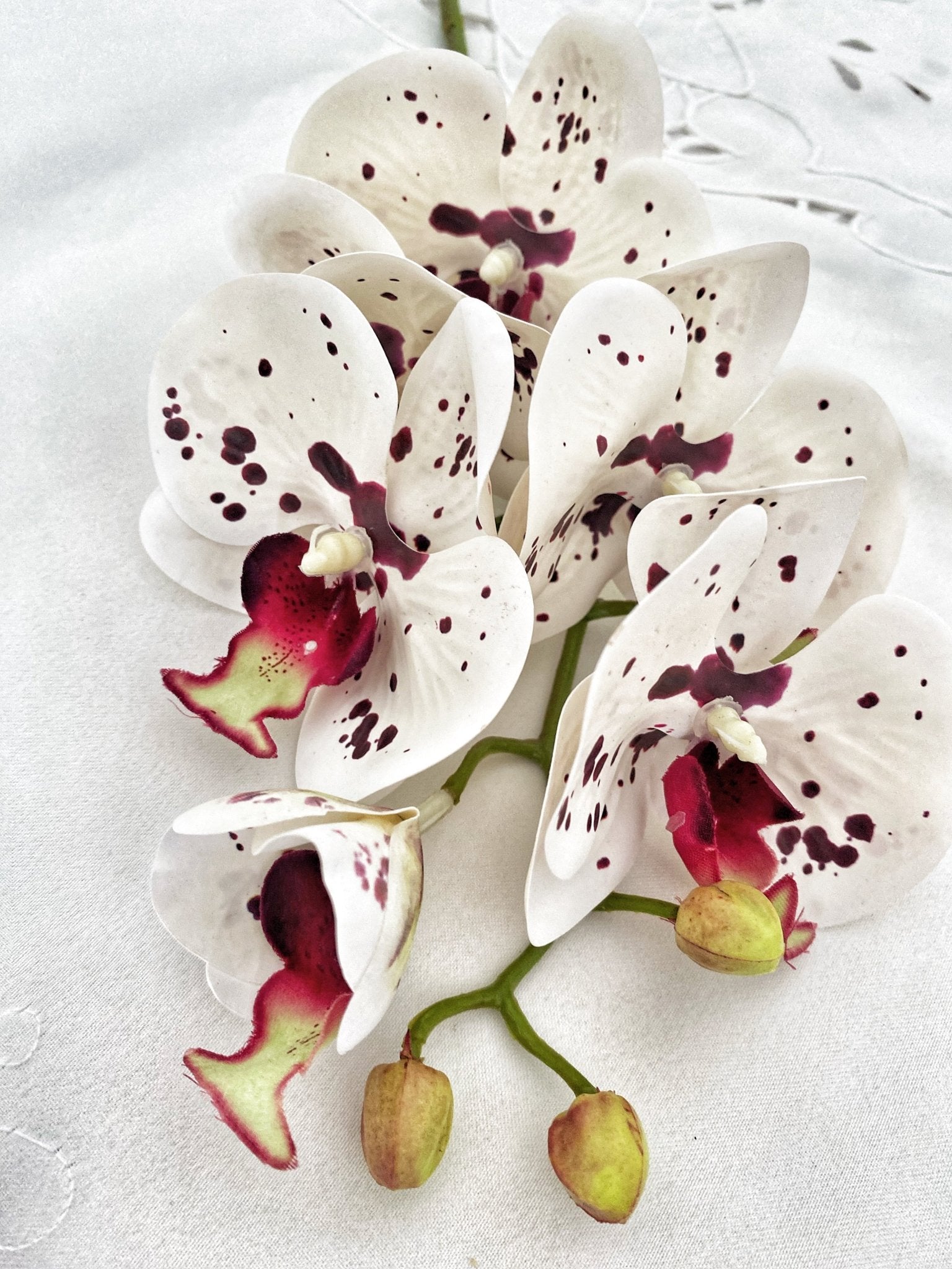 artificial white speckled orchid stem with dark red spots.  phalaenopsis orchid flower.