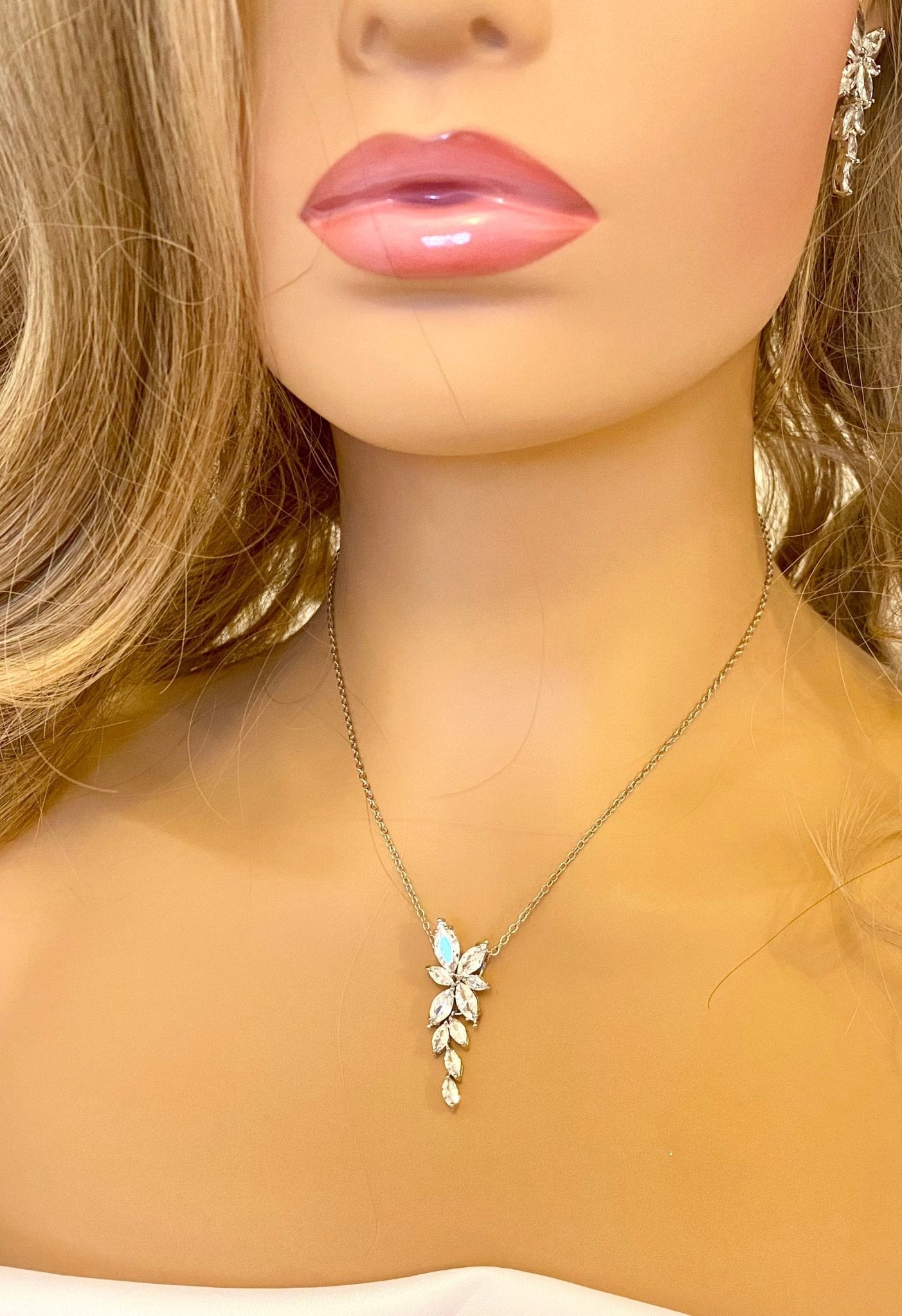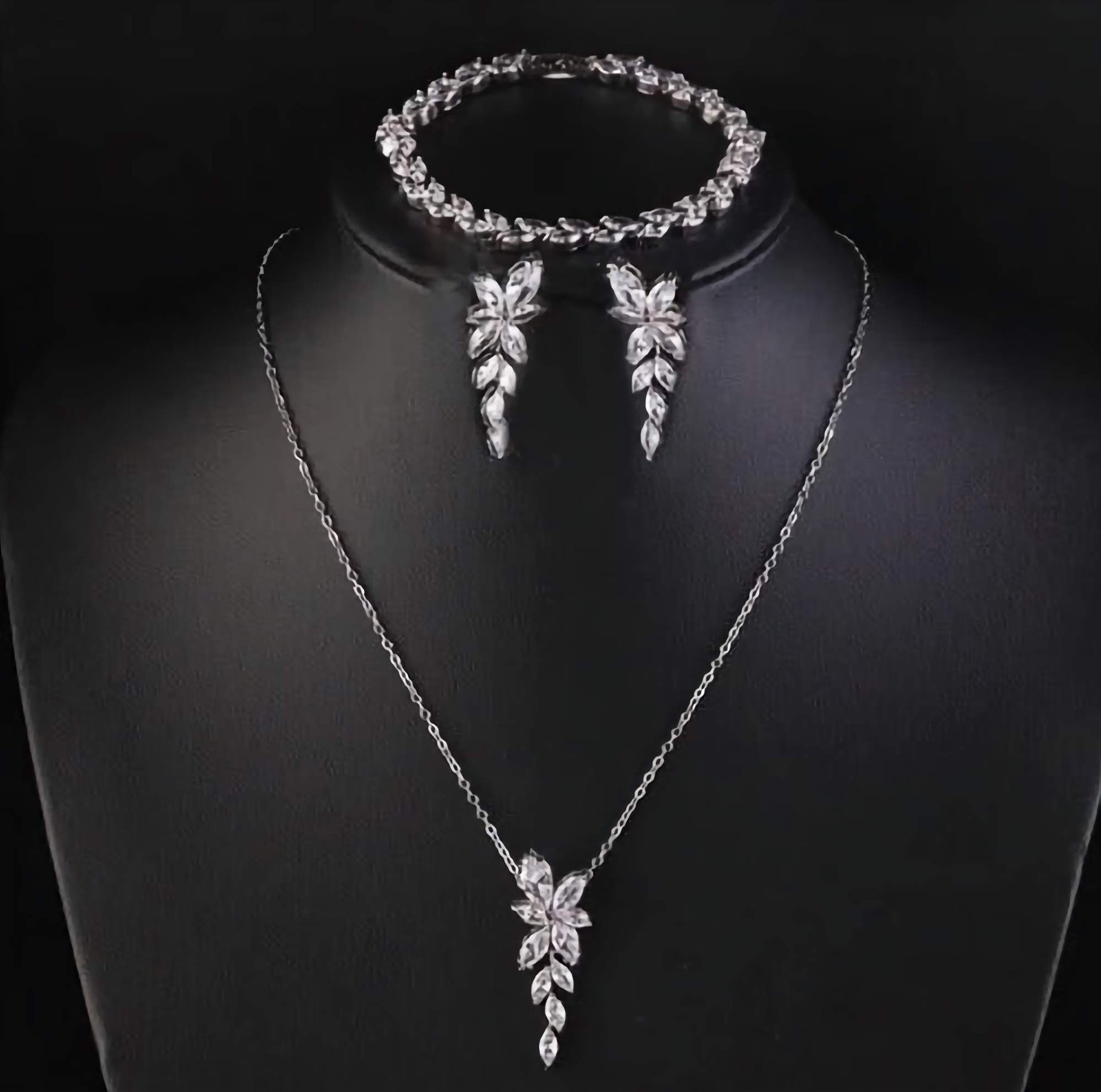 an exquisite bridal necklace set made using highest quality cubic zirconia aaa+ grade in a leaf design which beautifully compliments any bride on her special day. you can choose from the bridal necklace, star drop earrings or the whole wedding necklace set! this necklace set is in silver colour, but is also available in a gold colour. the necklace set comes in a jewellery box for you or perfect as a gift for her.