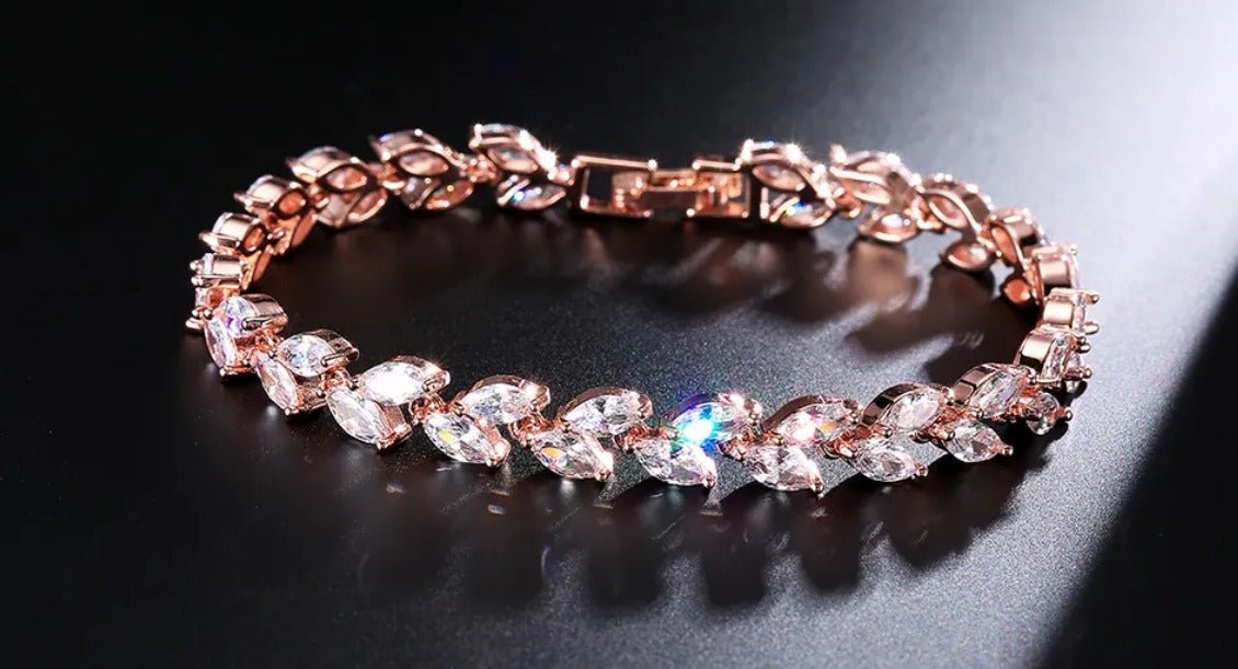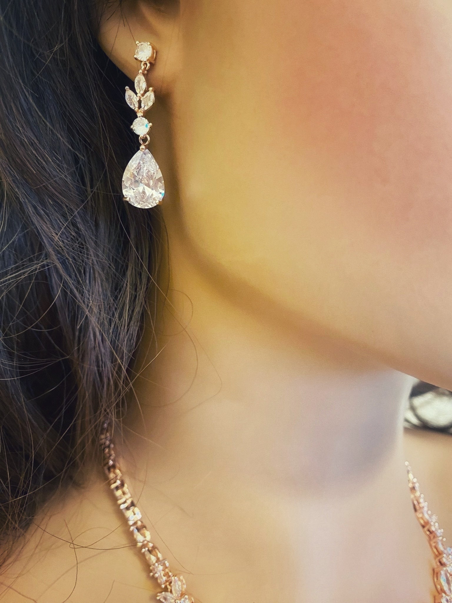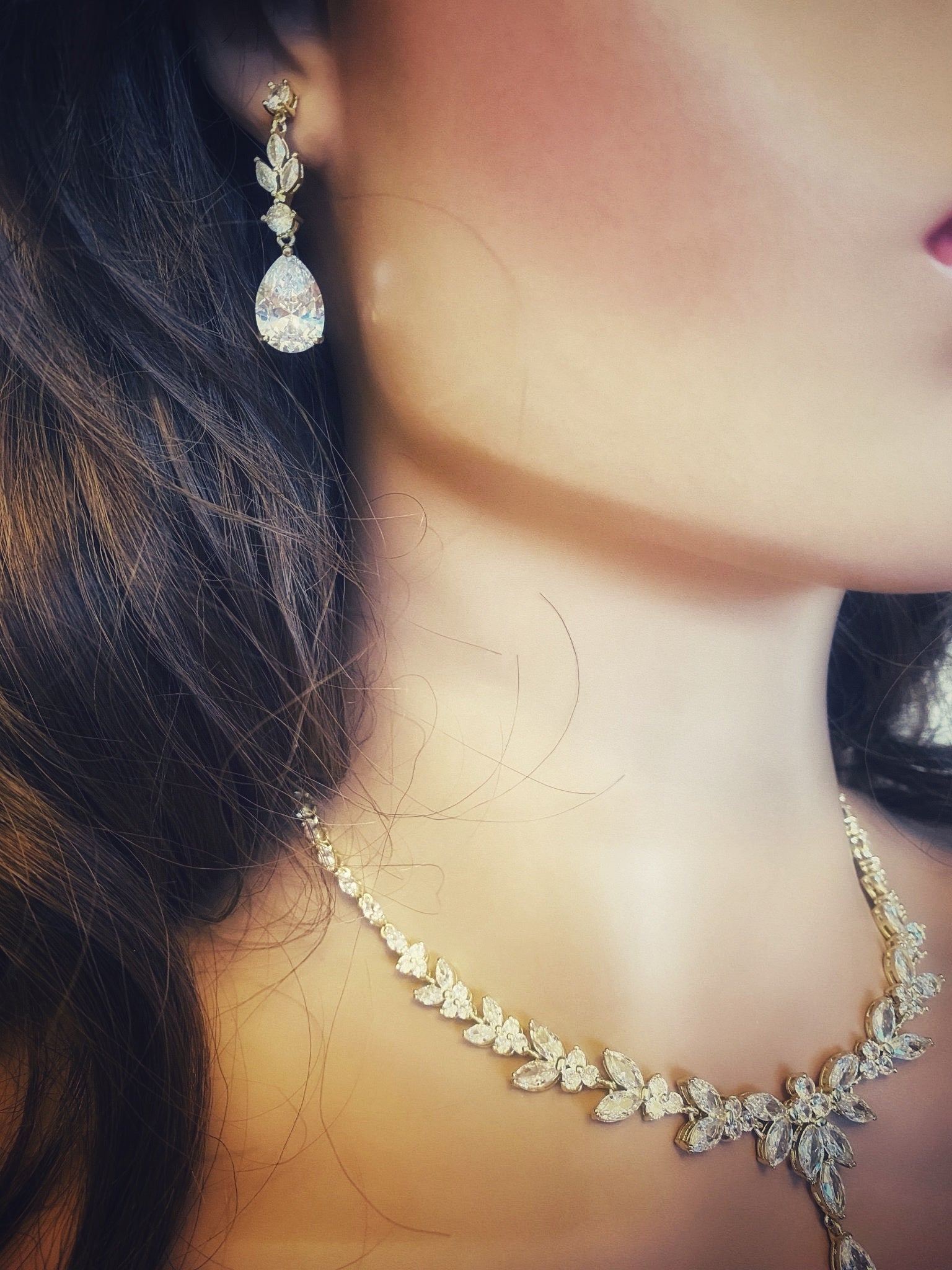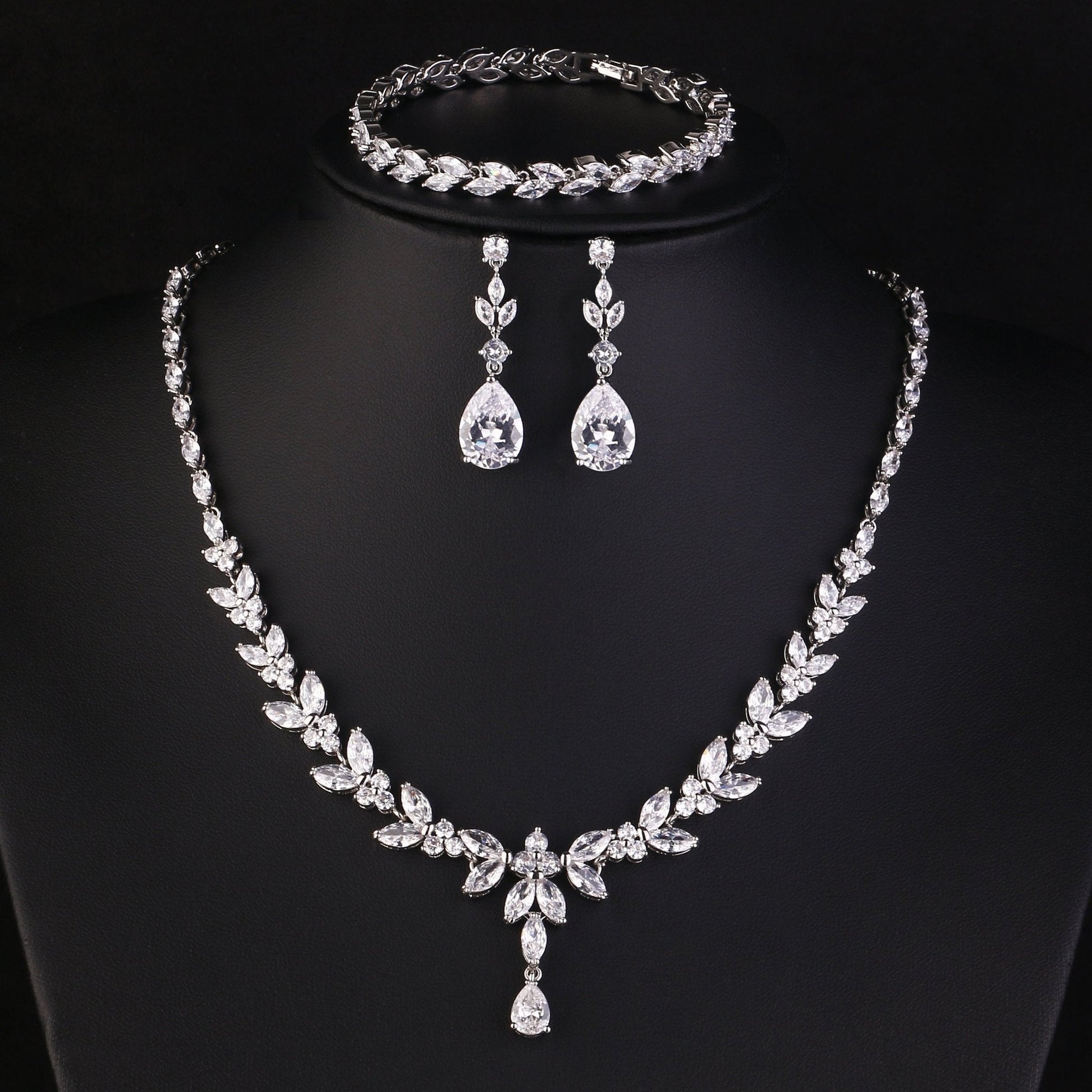 a beautiful necklace set featuring a quality cubic zirconia aaa+ grade in a leaf design which beautifully compliments any bride on her special day or makes a statement at that special party. you can choose from the bridal necklace, tear drop earrings or leaf style bracelet or the whole wedding necklace set! this necklace set is in silver, but also available in gold. we also have an option for a longer extendable bracelet which can be adjusted, please see photos. the necklace set comes in a jewellery box which makes a perfect as a gift for her.